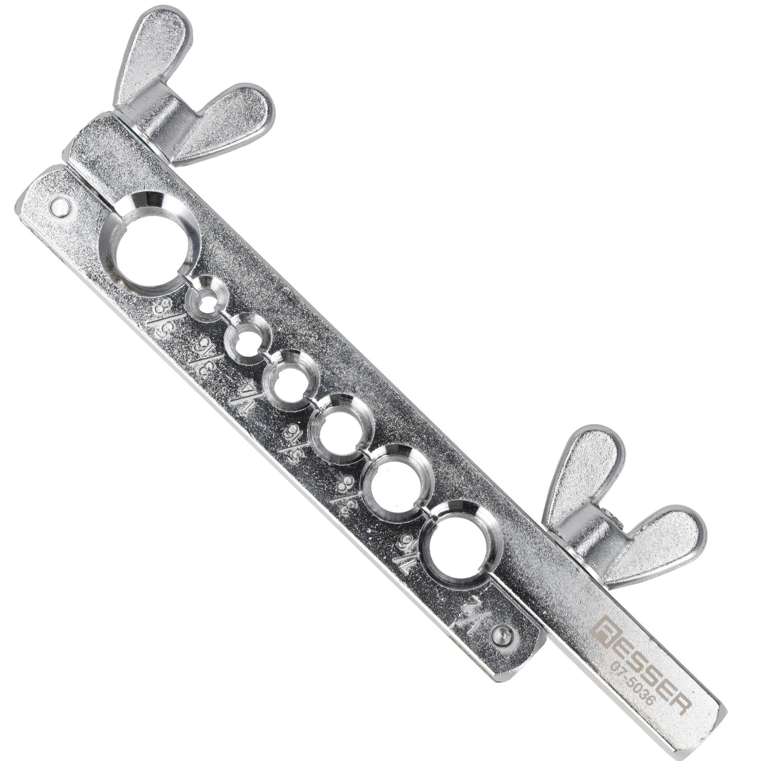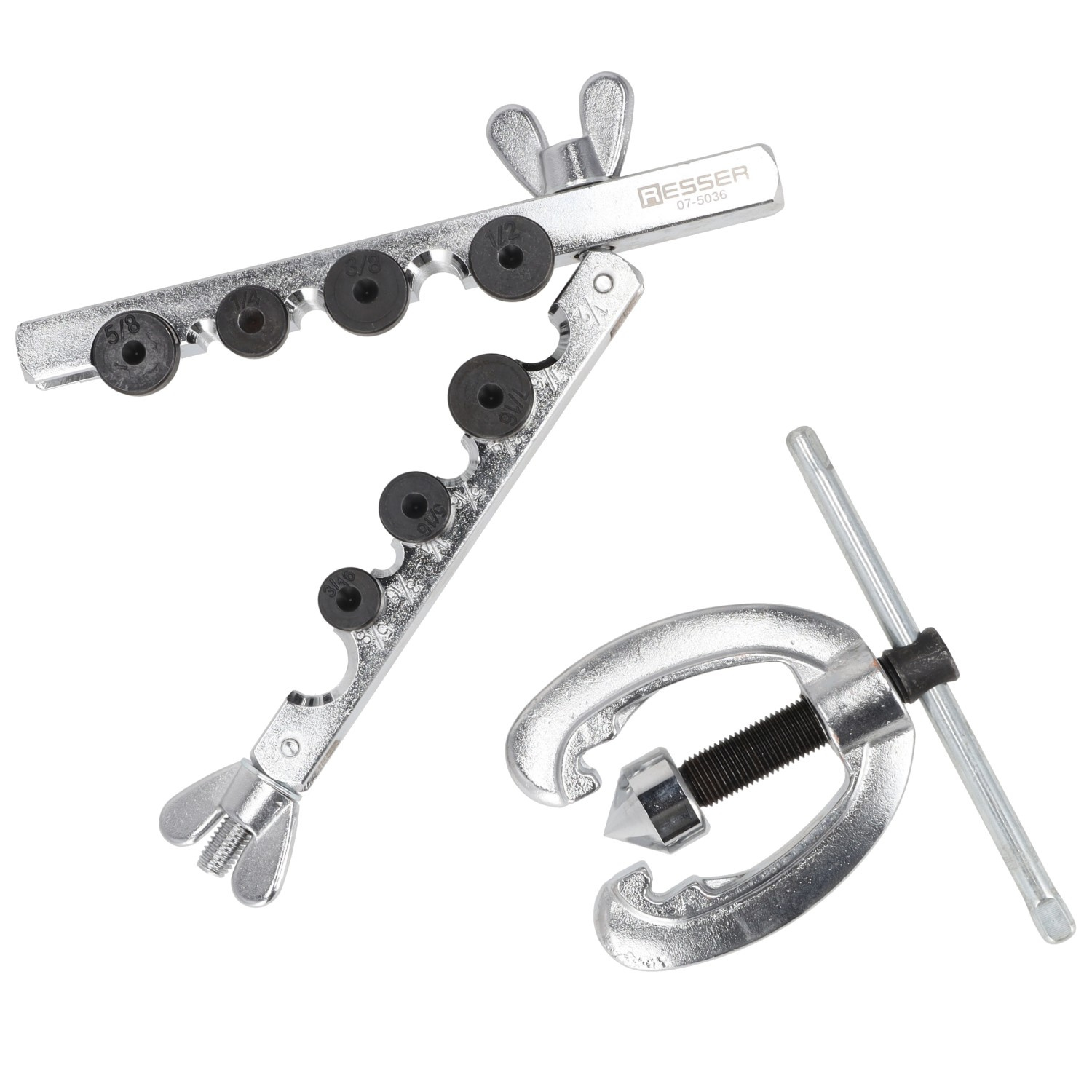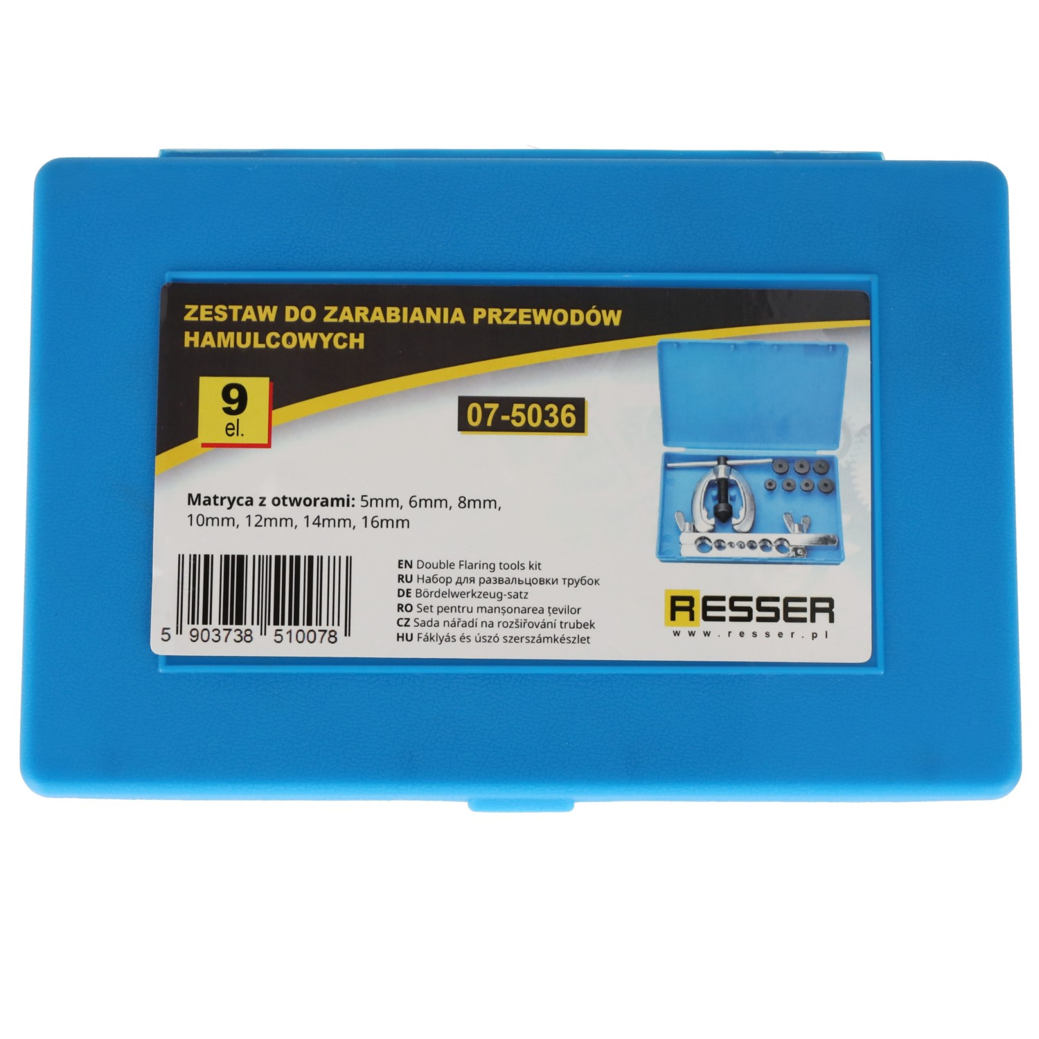 Brake pipe flaring kit with adapters, 9 pcs is a practical workshop tool designed for forming the ends of brake pipes made from copper and thin-walled aluminium tubing. It enables fast and precise preparation of pipes used in brake systems of passenger cars and vans. An essential tool for automotive workshops, service centers, and for home repairs.