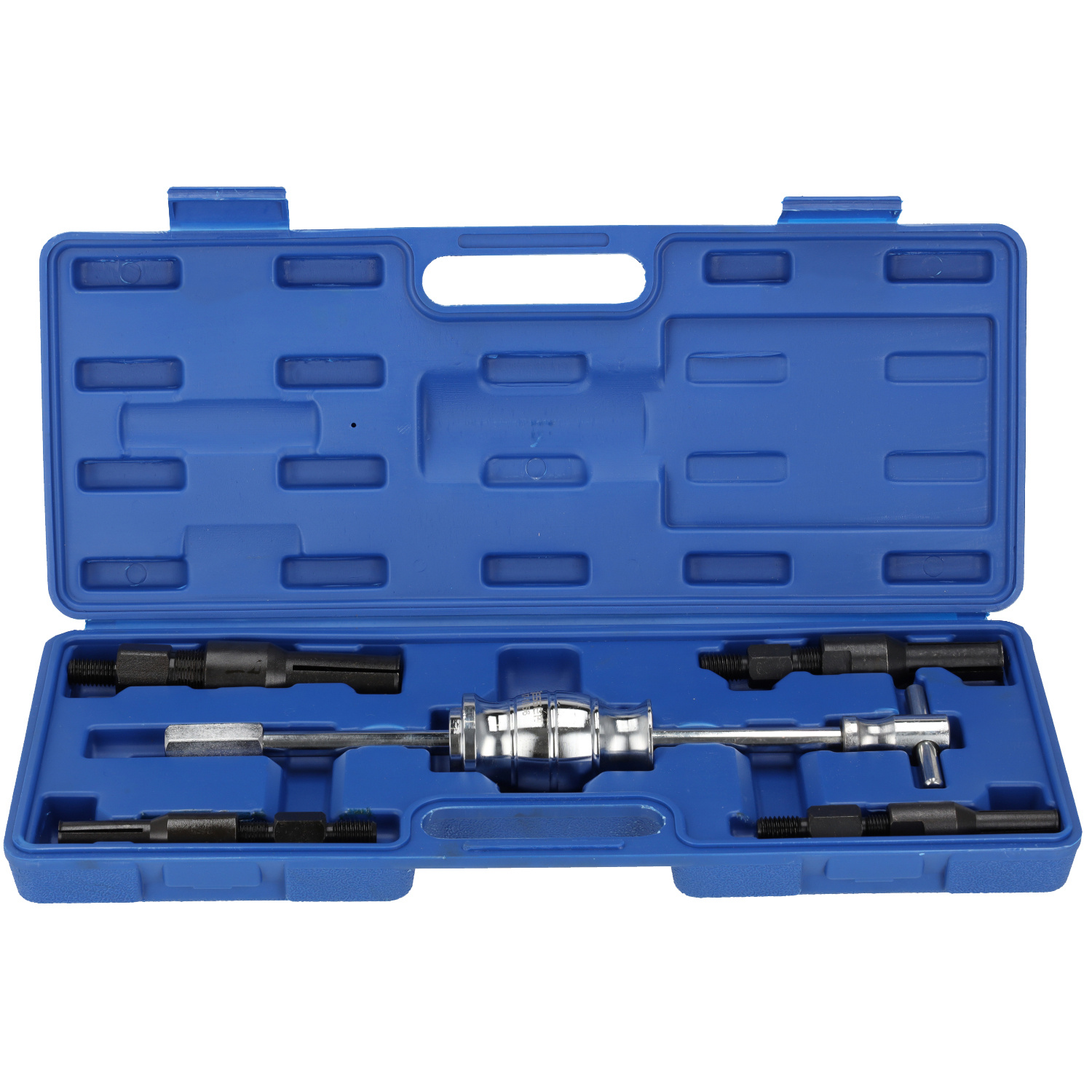 Internal bearing puller with slide hammer, 5 pcs is a professional workshop tool set designed for the removal of internally mounted bearings, including pilot bearings located at the end of the crankshaft, as well as bushings and components requiring precise extraction. The 1 kg slide hammer, combined with interchangeable adapters, ensures effective, controlled, and safe operation even in hard-to-reach areas.
