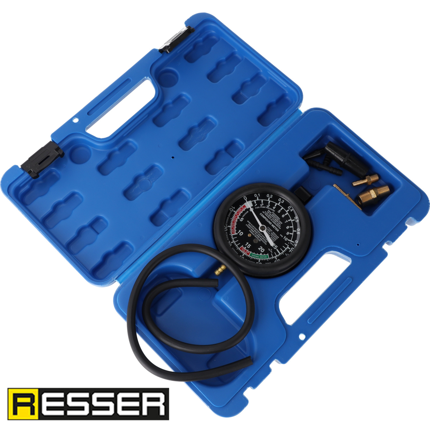 Products of the Resser brand are known for durability, precision workmanship, and reliability. The pressure tester has been designed for intensive workshop use – a clear gauge, tight connections, and solid materials ensure repeatable measurements and long service life.