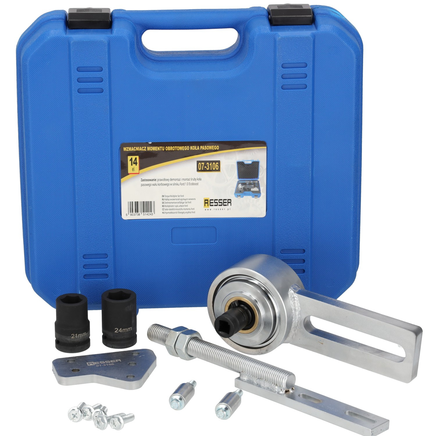 Products of the Resser brand are characterised by durability, precision and reliability. The torque multiplier is designed for professional servicing of Ford engines — robust construction, high strength and full compatibility with OE tools ensure secure tightening of the crank pulley on demanding EcoBoost and EcoBlue units.