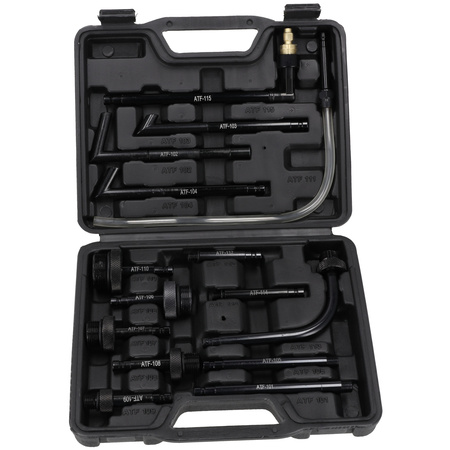 ATF-101 (Ford 1/8–27 NPT), ATF-102 (BMW, Honda, Nissan), ATF-103 (VW/Audi, Skoda), ATF-104 (VW/Audi, Porsche), ATF-105 (VW/Audi, Mini Cooper M10×1.0), ATF-106 (VW/Audi DSG M24×1.5), ATF-107 (VW/Audi CVT M22×1.5), ATF-108 (Mercedes M12×1.5), ATF-109 (VW, Skoda M18×1.5), ATF-110 (Audi/VW, Skoda M30×1.5), ATF-111 (Honda, Hyundai, Kia – elastyczny 300 mm), ATF-112 (Volvo 5/16–24 UNF), ATF-113 (Toyota, Lexus, BMW 7 Series M18×1.5), ATF-114 (Nissan, Infiniti M8×1.0), ATF-115 (VW Passat)