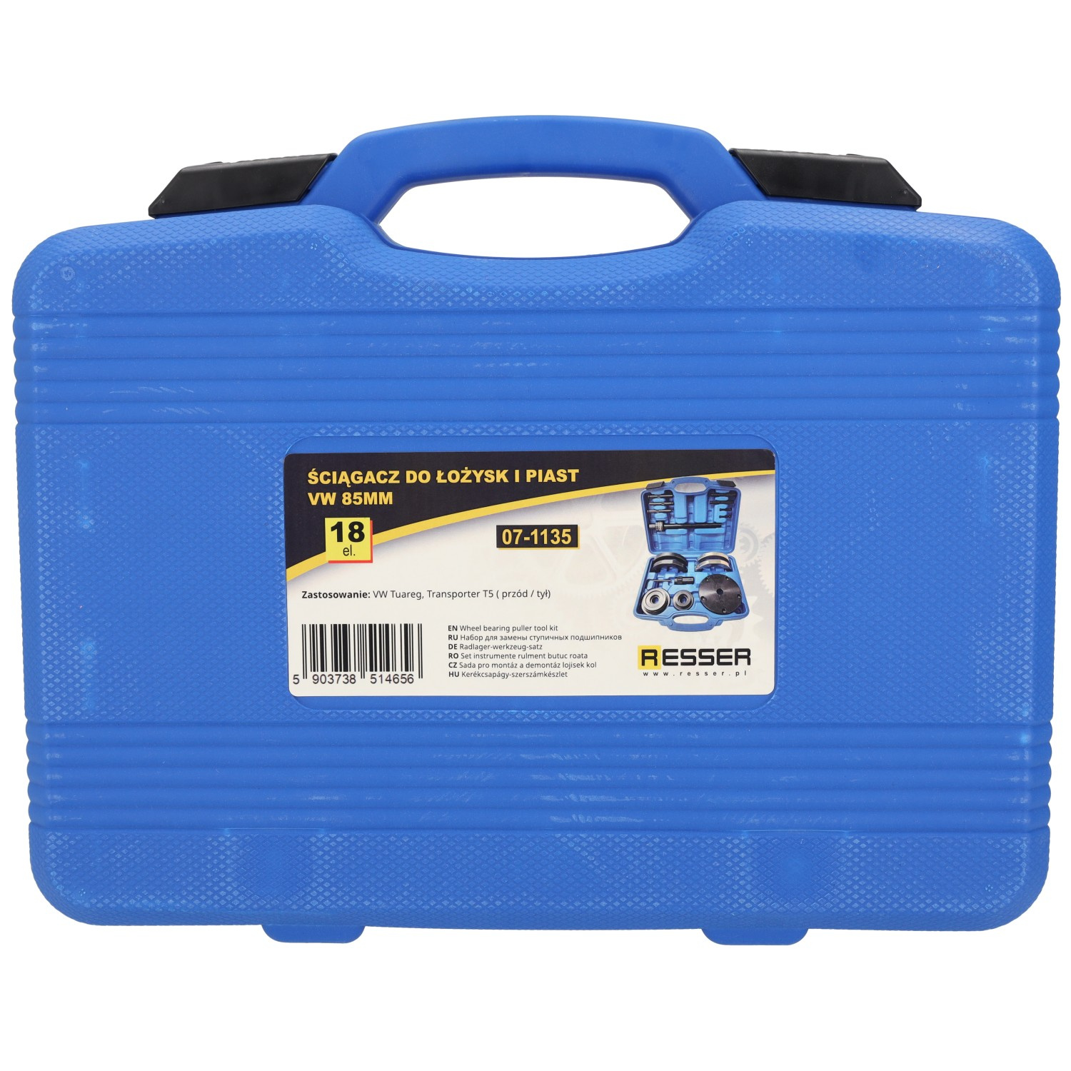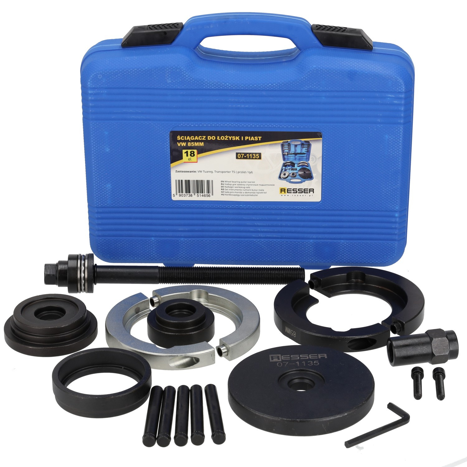Produkty marki Resser charakteryzują się trwałością, precyzją wykonania i niezawodnością. Ściągacz do łożysk piast został opracowany z myślą o profesjonalnych serwisach – solidna stal, precyzyjne prowadzenie i komplet odpowiednio dobranych adapterów zapewniają prawidłową, bezpieczną i szybką wymianę łożysk w pojazdach VW T5 oraz Touareg.
