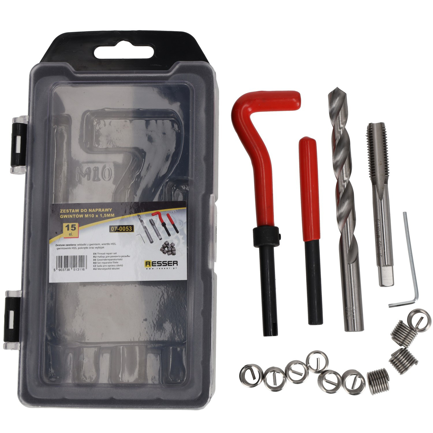 Produkty marki Resser charakteryzują się trwałością, precyzją wykonania i niezawodnością. Zestaw do naprawy gwintów został zaprojektowany z myślą o intensywnym użytkowaniu warsztatowym — narzędzia HSS i precyzyjne wkładki zapewniają solidną, długotrwałą regenerację gwintu M10 x 1,5 mm.